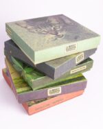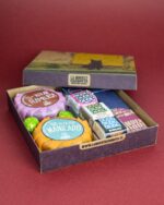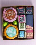 Hermosa caja de dos piezas que contiene gran variedad de chocolates, estos son: 2 alfajores, 2 toffeecados, 1 barra de cacao, 4 calugas de cacao,2manicados y cocadas. Los diseños de las cajas son fotografías o ilustraciones de autor.