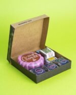 Caja que contiene una pequeña varidad de productos, como 1 alfajor, 3 toffeecados,2 calugas de cacao y 1 manicado. Los diseños de las cajas son fotografías o ilustraciones de autor.